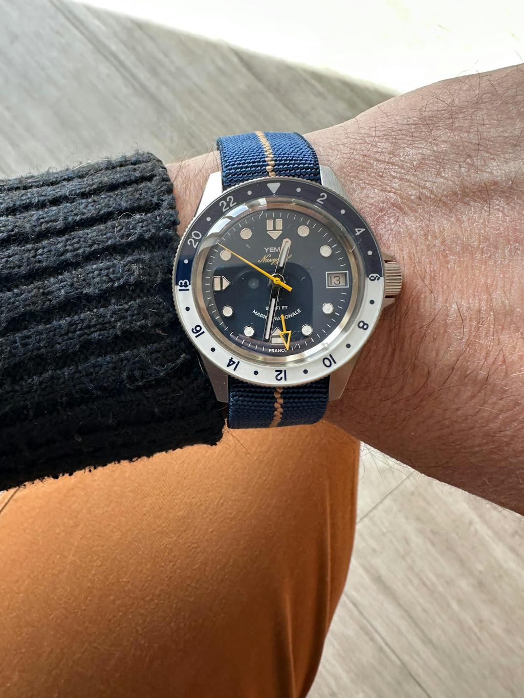 Son cadran est inspiré de la Navygraf II des années 1970 avec index appliqués en acier poli pour une meilleure sensation de profondeur et de relief. Cadran bleu et blanc Marine nationale avec trotteuse et aiguille GMT jaune, couleur historique de la Navygraf pour un meilleur contraste et une meilleure lisibilité.